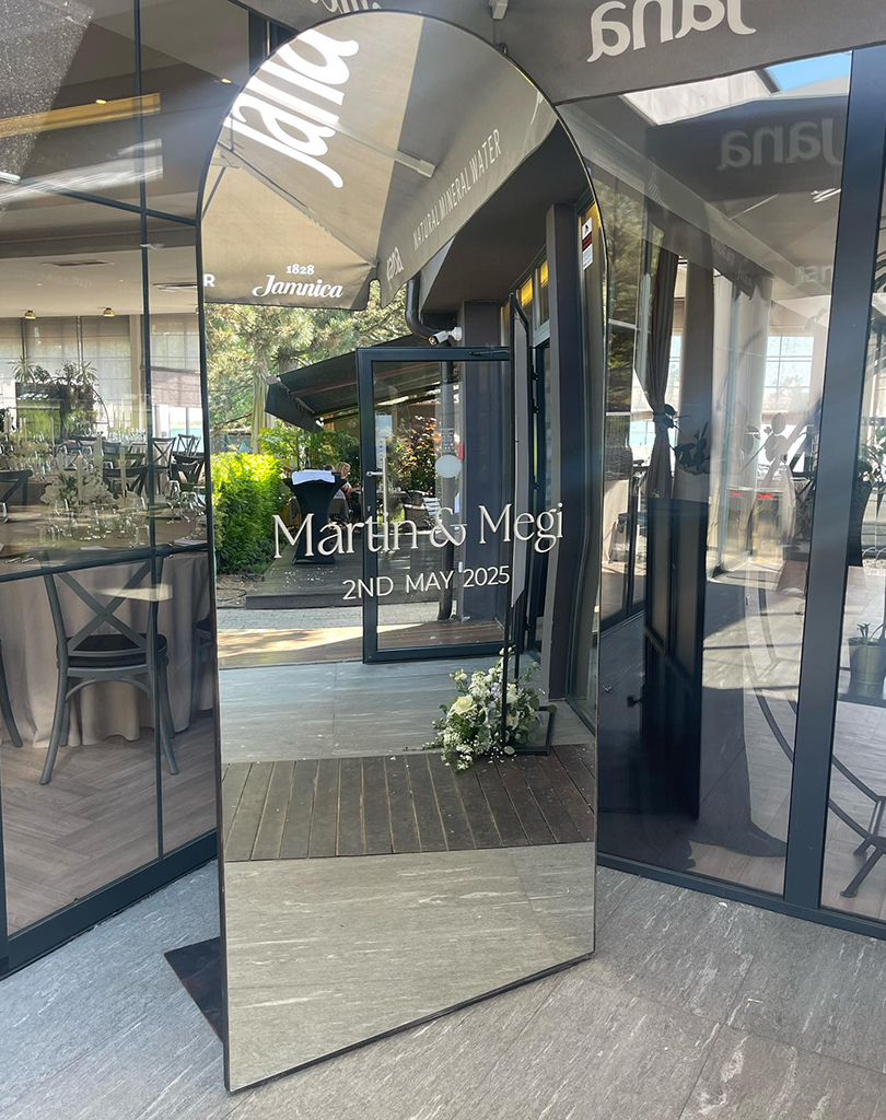 Wedding Mirror je elegantan i atraktivan dodatak vjenčanju koji služi kao savršena dobrodošlica gostima i dekorativni naglasak prostora. Ogledalo se u potpunosti personalizira, a dizajn se prilagođava stilu i temi vašeg vjenčanja.